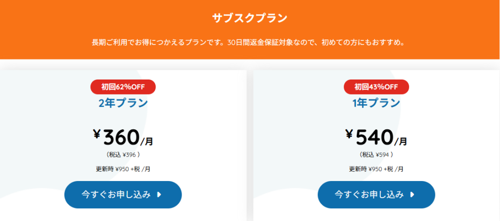 2年プランなら初回62%OFFで月額396円(税込)から利用可能。長期利用する方におすすめです。